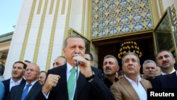 Президент Турции Реджеп Тайип Эрдоган выступает перед своими сторонниками после пятничной молитвы. Анкара, 22 июля 2016 года.