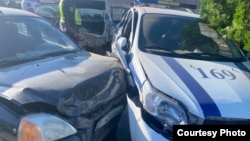Так, сотрудник Службы исполнения наказаний на автомобиле Kia Rio в селе Кара-Ой у здания ОБДД близ Чолпон-Аты врезался в припаркованные патрульные машины.